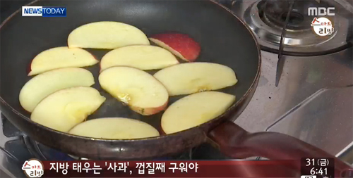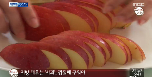 사과를 먹기 좋은 크기로 잘라 과육이 부드러워질 때까지 구우면 되는데, 이때 껍질을