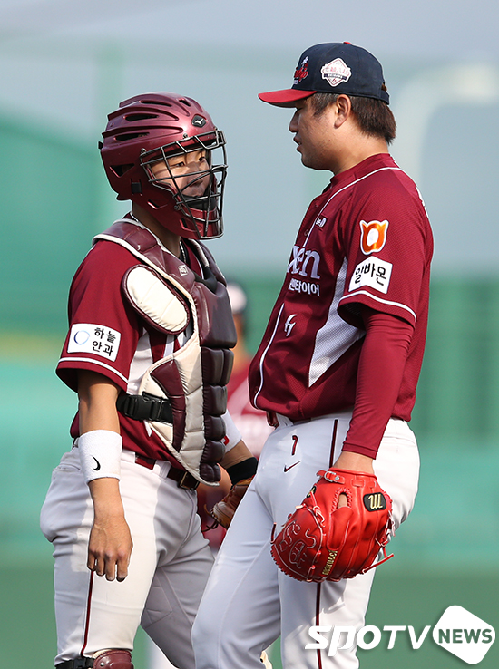 [SPOTV NEWS=오키나와(일본), 한희재 기자] 3일 오후 일본 오키나와현 이시카와구장에서 열린 LG 트윈스와 넥센 히어로즈의 연습경기, 9회말 1사 만루 넥센 마무리 손승락과 포수 김재현이 이야기를 나누고 있다.