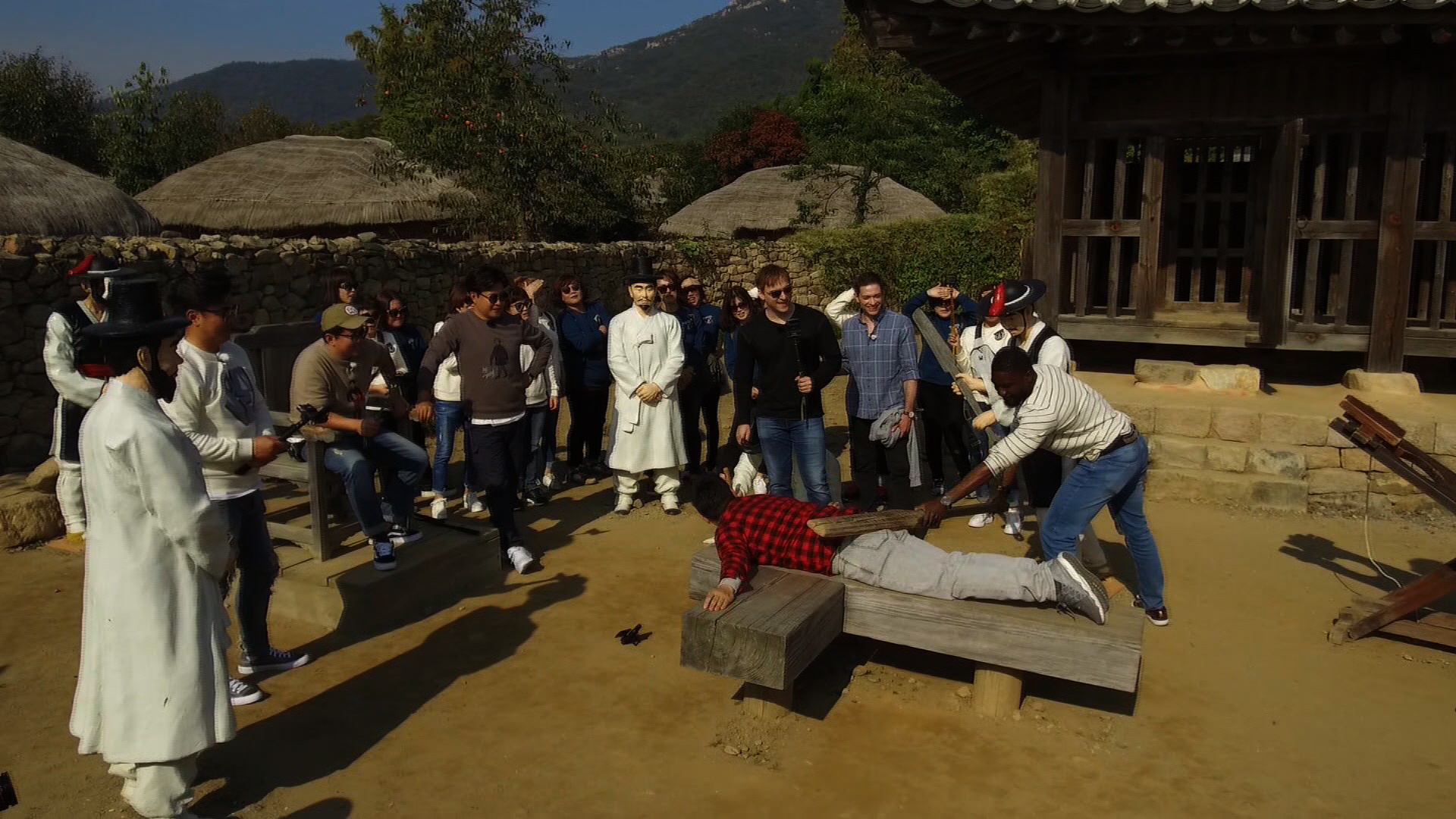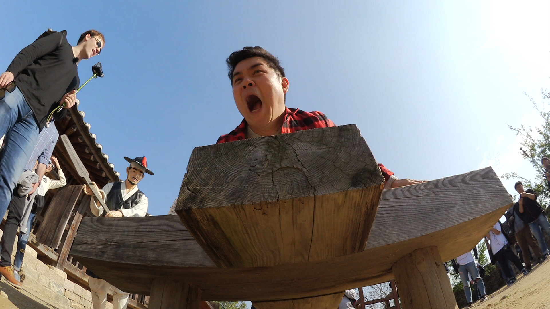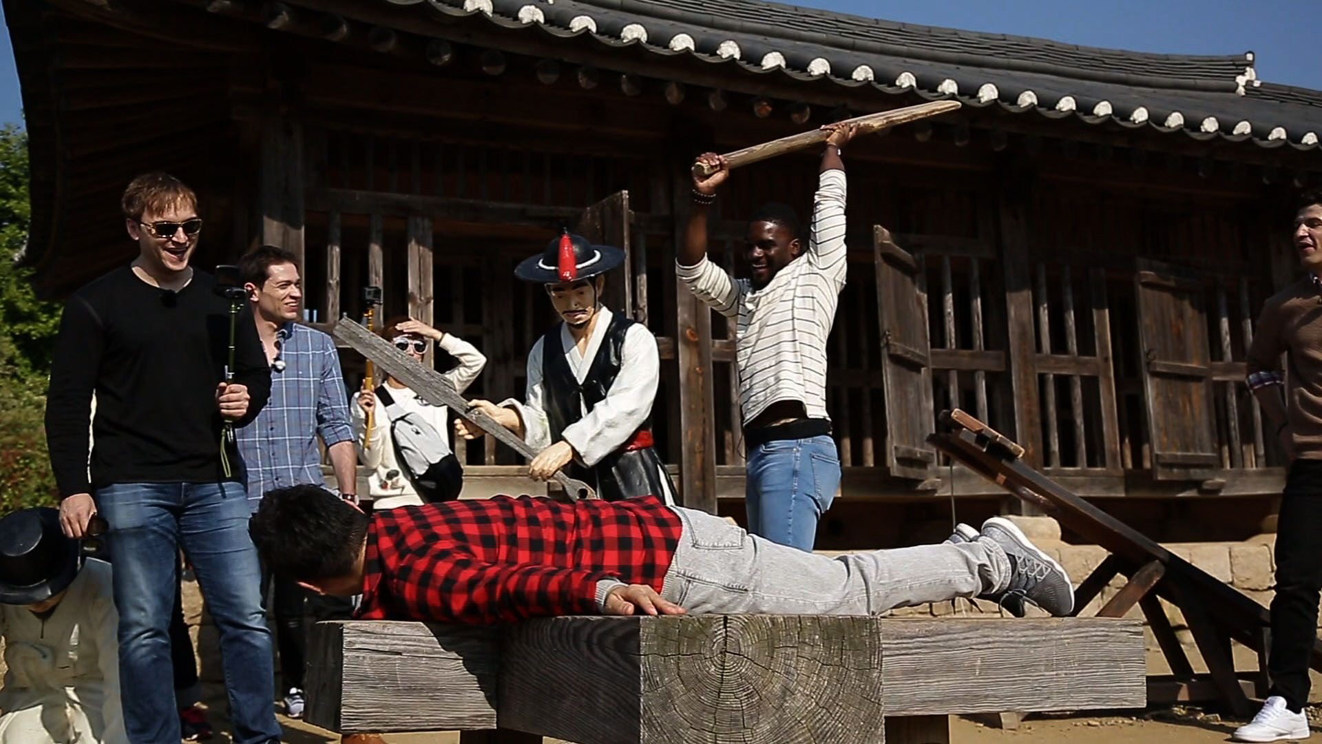 옥사를 둘러보던 김용만은 곤장 맞기 체험장에서 발길을 멈췄다. 호기심을 참지 못한 그는 그대로 곤장대에 누웠다. 이를 기다렸다는 듯 패키지 막내 샘 오취리가 몽둥이를 집어 들어 웃음을 자아냈다.