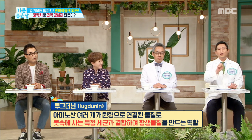 함께 출연한 이선민 가정의학과 전문의는 “2016년 국제 학술지 네이처에 독일 튀빙겐 대학 연구팀이 발표한 내용에 따르면 코딱지에는 새로운 종류의 항생물질이 있다”고 설명했다. 이 과정에는 ‘루그더닌(lugdunin)’이라는 물질이 관여하는데, 이는 아미노산 여러 개가 원형으로 연결된 물질로 콧속에 사는 특정 세균과 결합해 항생물질을 만드는 역할을 한다.