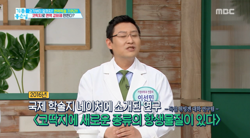 MBC ‘기분 좋은 날’의 김정근 아나운서는 24일 방송에서 ‘김정근의 면역력뉴스’를 통해 코딱지에 대한 새로운 사실을 전했다. 다름이 아니라 코딱지에는 외부에서 들어오는 유해 세균 등을 퇴치하기 위한 천연 항생물질이 다량 함유돼 있다는 것이다.