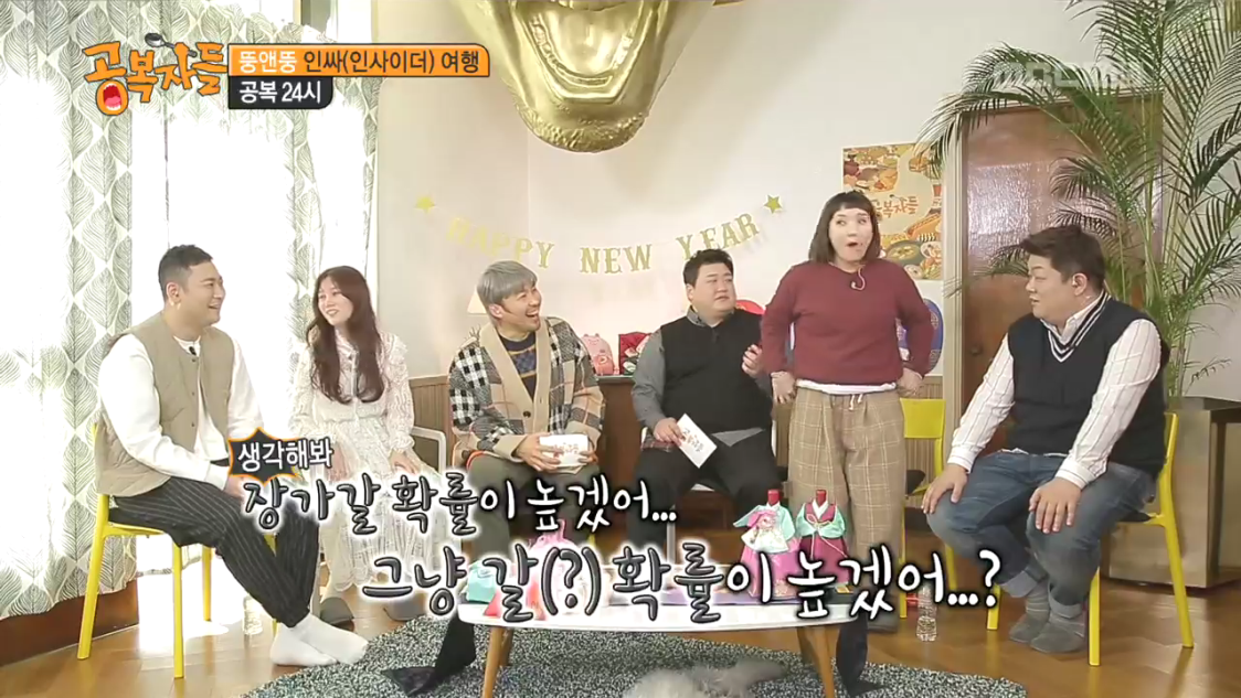 노홍철은 유민상의 사주에 대해 “사먹고 싶은 것이 많아 돈을 많이 쓰게 되니 주의하라”라고 한 다음 “다음건 못읽겠다”라며 눈치를 살폈다. “원하는 이성을 못만난다”라는 신년 운세에 유민상은 “도대체 언제까지!”라며 폭발했다.