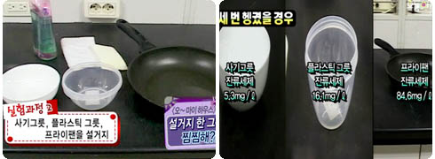 플라스틱 그릇 잔류세제는 16.1mg/L, 프라이팬 잔류세제는 84.6mg/L가 검출됐다.