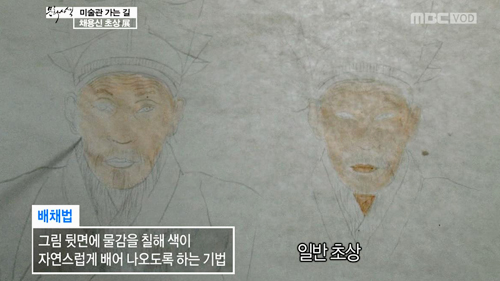 종이의 뒤편에 물감을 칠해 색이 자연스럽게 앞으로 배어 나오게 하는 배채법. 뒤에서 칠하고 앞에서 보고. 수백 번의 붓질이 필요하다. 붓을 통해 대상과 화가가 혼연일체가 될 때 비로소 초상화는 완성되는 것이다.