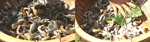 그 다음 요리는 전통 방식의 추어탕. 미꾸라지 요리는 첫째도, 둘째도 손질이 가장 중요한 법. 요리 전 소금을 뿌려줘야 해감도 되고 비린내도 사라진다. 그 뒤, 호박잎의 까칠한 면을 미꾸라지 있는 쪽으로 대서 박박 문질러주면 이물질 제거 및 비린내 제거에 효과적이다.