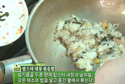 참기름과 날치알, 갖은 채소를 함께 볶아주면 고소한 내장 볶음밥이 완성된다.
