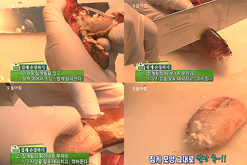 다음으로 탐스럽게 잘 익은 랍스터의 단단한 껍데기 벗기는 법은 가위로 다리와 더듬이를