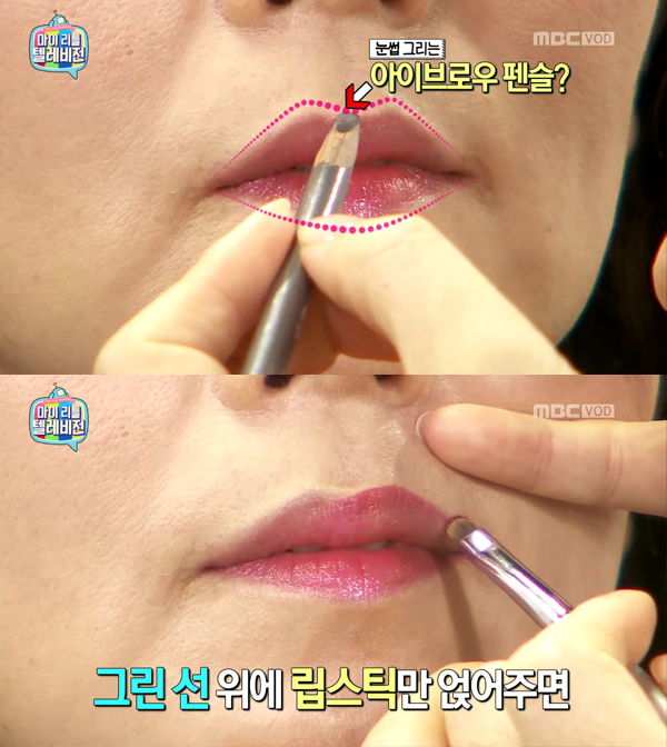 "아이브로우로 옛날의 입술 형태를 돌려줘요.", "그리고 그 위에 립을 얹으면 감쪽같이 완성!" 입술을 살리는 꿀팁은 아주 간단하다. 아이브로우로 입술 선을 살짝 올려서 그린 다음, 립스틱을 묻힌 립브러쉬로 그 위를 덮을 것! 그러면 펜슬 선이 사라지면서 자연스럽게 볼륨을 더한 입술을 연출할 수 있다.