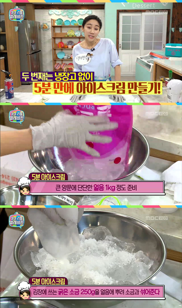 1. 큰 양푼에 단단한 얼음을 1kg를 넣고 그 위에 굵은 소금을 뿌려준다. (영하 21도까지 온도가 확 내려가게 되는 원리!)