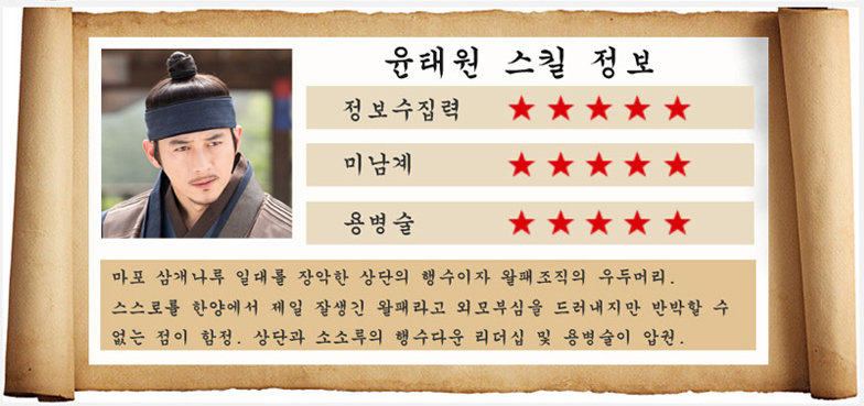 윤태원은 마포 삼개나루 일대를 장악한 상단의 행수이자 왈패조직의 우두머리로 꽃미남 외모를 자랑한다. 여기에 리더쉽을 바탕으로 한 전천후 용병술을 사용한다. 한양 최고의 기방 소소루의 행수 교하(오나라)부터 최고 기녀 소정(윤주희)까지 태원의 도움 요청이라면 두 팔을 걷어 붙이고 있다.