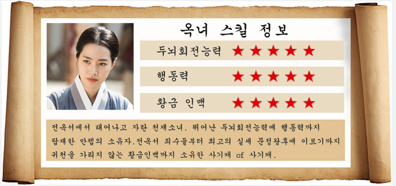 먼저 옥벤져스의 주축 옥녀는 두뇌회전능력과 행동력에서 만렙을 찍었다. 특히 옥녀는 경국대전을 통째로 외울 줄 아는 놀라운 능력과 더불어 무술실력까지 갖춰 걸크러쉬를 유발하기도 한다. 또한 전옥서 죄수부터 시작해 문정왕후(김미숙)에 이르기까지 귀천을 가리지 않는 황금 인맥까지 소유하고 있다.