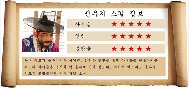 마지막으로 사기로 만렙을 찍은 당대 최고의 풍수가이자 사기꾼 전우치의 스킬 정보가 눈에 띈다. 전우치는 화려한 언변을 바탕으로 하는 사기술, 또한 며느리도 못 알아 볼 분장실력을 선보인다. 스킬 정보에 첨부된 사진부터 범상치 않은 분장을 하고 있어 배꼽을 잡게 만들 정도. 이에 대 사기극을 시작한 ‘옥벤져스 행동대장’ 전우치가 어떤 모습을 보일지 기대감을 한껏 증폭시킨다.