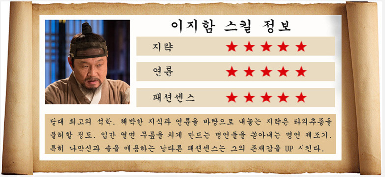 여기에 동시대 최고의 석학 이지함이 옥벤져스 세 번째 멤버로 이름을 올렸다. 이지함은 해박한 지식과 연륜을 지니고 있는데, 그런 만큼 내놓는 의견들 모두 타의 추종을 불허할 정도. 더욱이 머리에 솥뚜껑을 쓰고 다니는가 하면, 화창한 날씨에도 나막신을 애용하는 등 패션 철학은 그를 돋보이게 하는 매력이다.