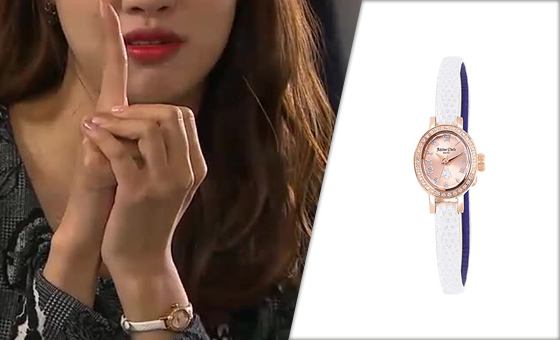 이 장면에서 김자경은 고혹적인 장미가 수놓아진 진그레이 컬러의 플레어 원피스를 매치한 한편, 프레임을 따라 스톤장식이 수놓아진 유니콘 로고의 손목시계를 매치해 세련된 느낌을 살렸다.
