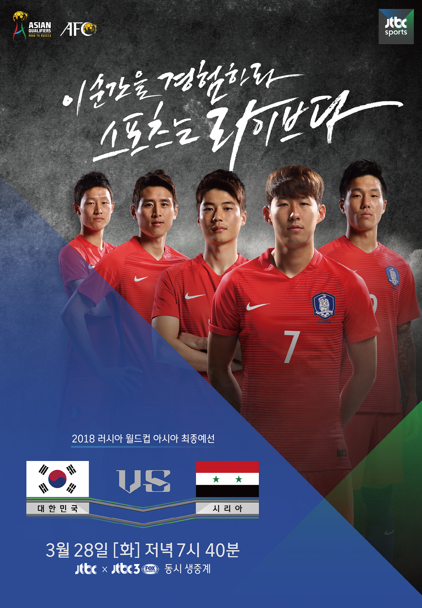 슈틸리케호의 운명이 걸린 경기이자 올해 첫 대한민국에서 개최되는 A매치가 될 ‘2018 러시아 월드컵 아시아 최종예선’ 대한민국 대 시리아의 경기는 28일(화) 저녁 7시 40분에 JTBC와 JTBC3 FOX Sports가 단독 중계한다.