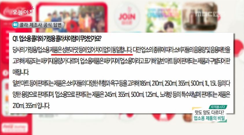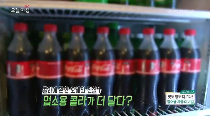 ‘가정용’ 콜라의 경우 판매를 위해 바코드가 붙어있는 것에 반해, ‘업소용’ 콜라는 일반 소매점에서의 판매를 막기 위해 바코드가 없었다. 또한, ‘가정용’과 ‘업소용’ 콜라의 열량과 영양정보는 동일했다.