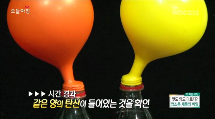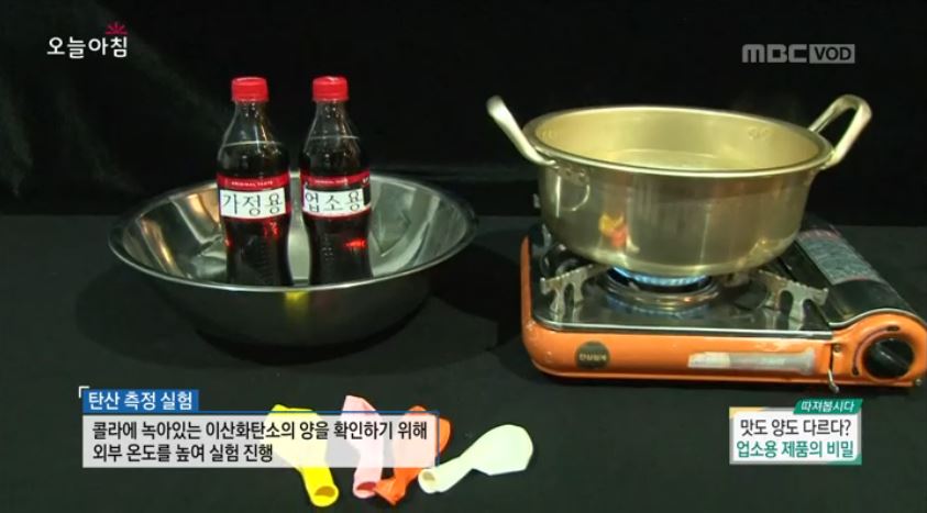 먼저 당도를 측정해 보니, 둘 다 9.7Brix로 동일했다. 이어 탄산 측정을 위해 외부 온도를 높여 실험해봤더니, ‘업소용’과 ‘가정용’ 모두 같은 양의 탄산이 들어있는 것으로 나타났다.
