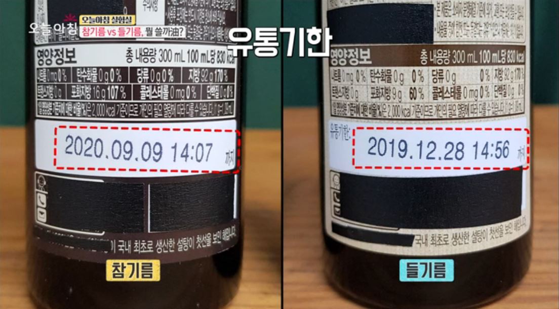 먼저 색깔을 확인한 결과, 참기름이 들기름보다 좀 더 진했다. 유통기한도 참기름이 훨씬 길었는데, 들기름은 강력한 항산화 물질이 없어 산패 속도가 빠르기 때문이었다. 그래서 들기름은 산소와 접촉하지 못하도록 뚜껑을 꽉 막아서 냉장 보관을 하는 것이 좋았다.