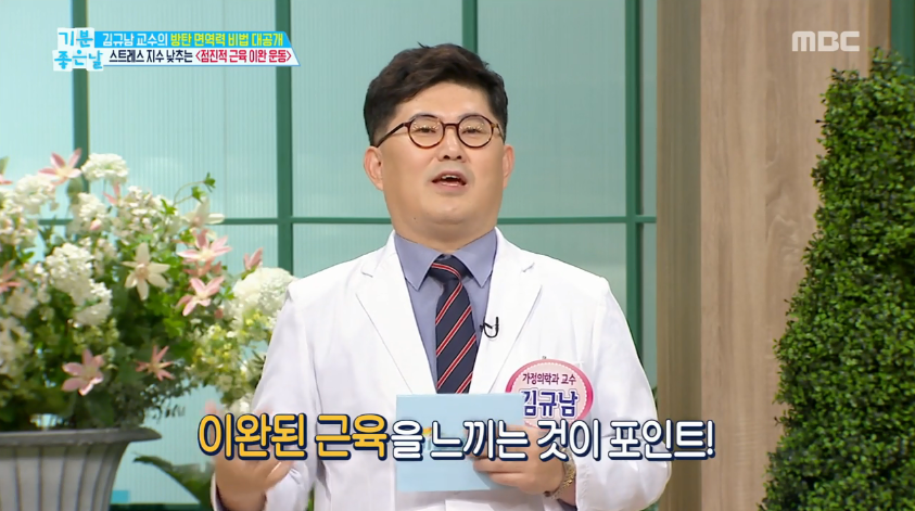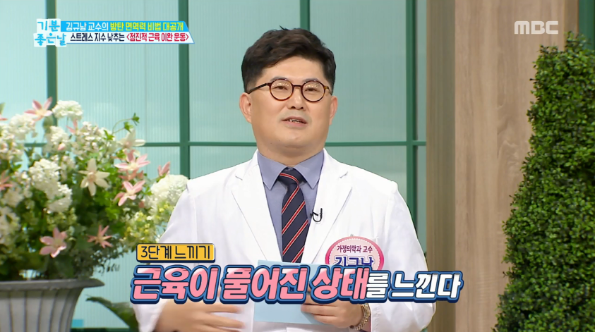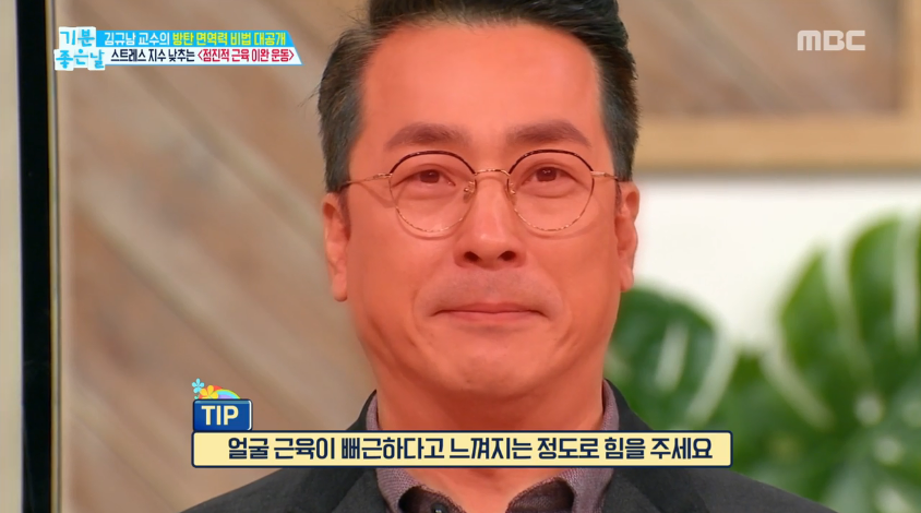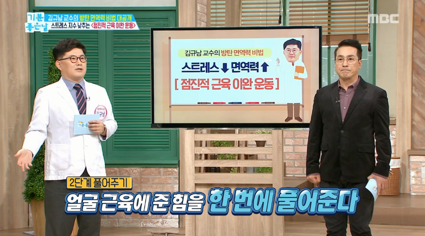 핵심은 잔뜩 긴장했던 근육을 탁 풀어준 뒤 근육이 편안하게 풀린 상태를 느끼는 것이다. 이완된 근육을 느끼는 것만으로도 스트레스가 풀리고 개운해지는 효과가 있다고 김규남 교수는 설명했다. MC 김한석 역시 이 운동을 직접 해 본 뒤 “뭔가 느낌이 다르다”고 말했다.