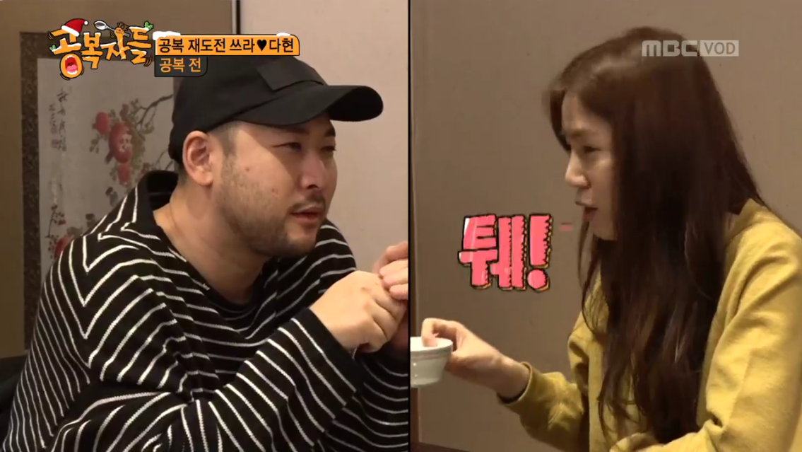 공복 전 최후의 만찬을 함께 한 미쓰라-권다현 부부는 “우리는 두 명이니까 말려줄 수 있지”라며 자신했다. 권다현이 “오빠~”라며 공복 실패를 유도했지만 미쓰라가 철벽 방어를 하자 “퉤”라며 왕년에 놀던(!) 모습을 보였다.