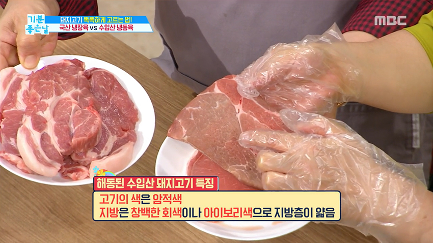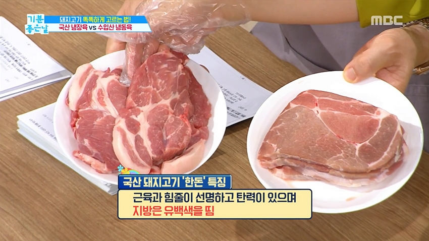 ▶ 국산 냉장육: 국내 돼지고기 '한돈'은 근육과 힘줄이 선명하고 탄력이 있으며 지방은 유백색을 띤다.