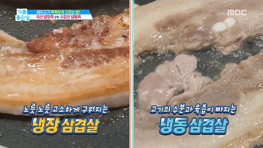 ▶ 국산 냉장육: 고기의 수분과 육즙이 빠져 하얗게 육즙이 나온다.