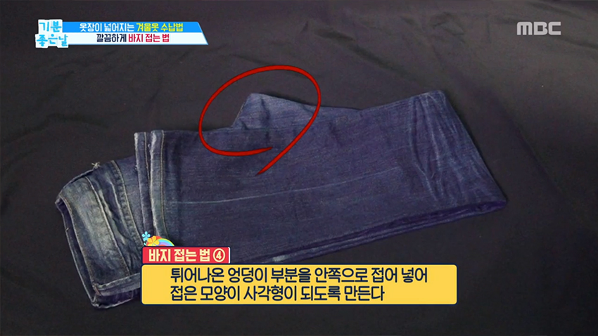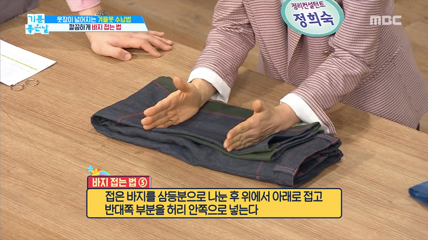 5. 접은 바지를 삼등분으로 나눈 후 위에서 아래로 접고 반대쪽 부분을 허리 안쪽으로 넣는다.