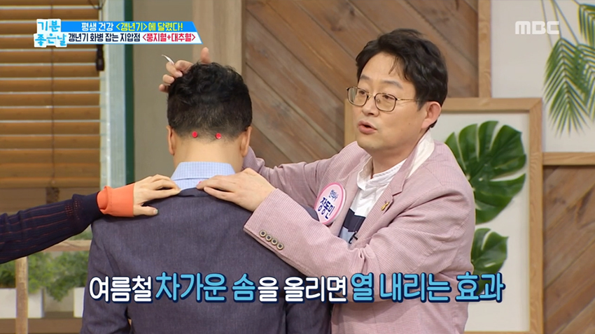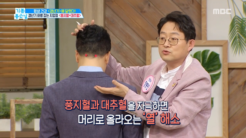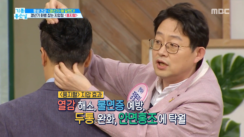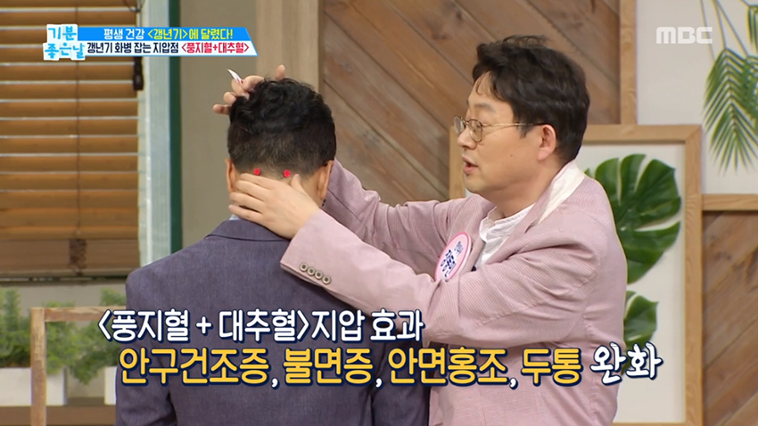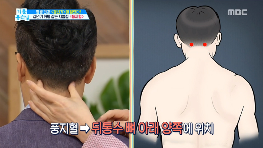 1. 두통수 뼈 아래 양쪽에 위치한 풍지혈은 열감 해소와 함께 불면증 예방, 두통 완화, 안면 홍조에 좋은 효과를 얻을 수 있다.