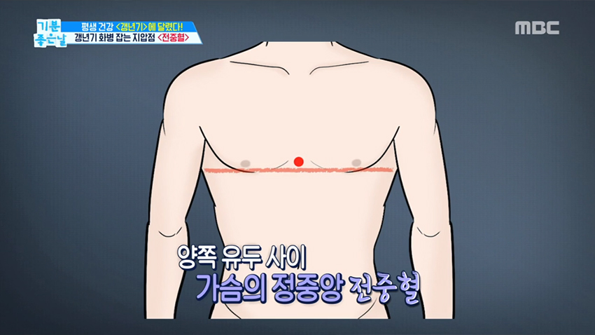 1. 전중혈은 양쪽 유두 사이 가슴의 정중앙에 위치해있으며 스트레스, 우울, 울분 등의 감정과 연관된 혈자리이다.