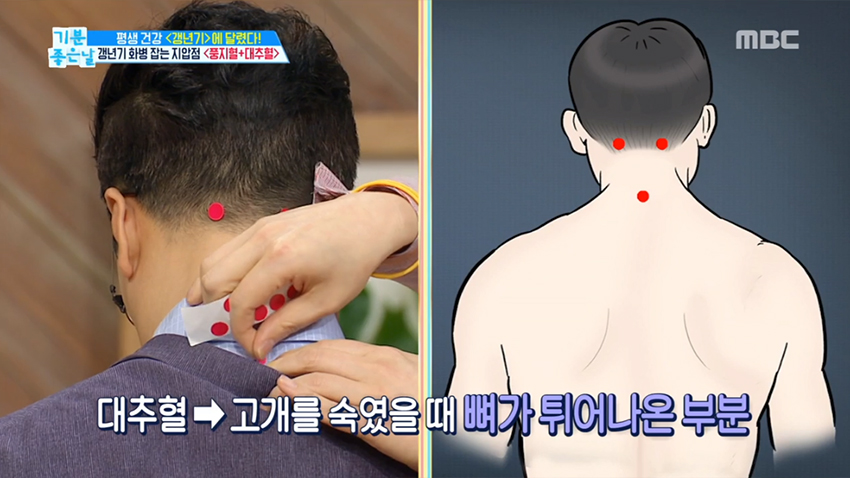 4. 풍지혈과 대추혈을 자극하면 머리로 올라오는 열을 해소할 수 있고 지압을 해주면 안구건조증, 불면증, 안면홍조, 두통을 완화할 수 있다.