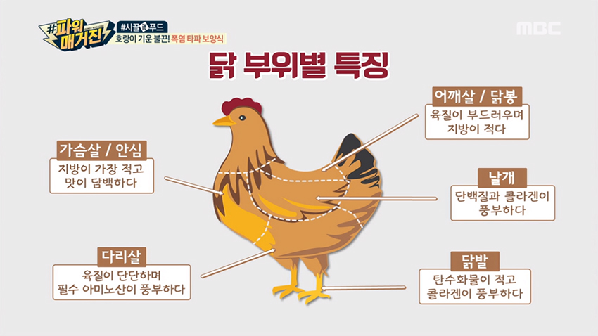 - 어깨살 / 닭봉 : 육질이 부드러우며 지방이 적다.