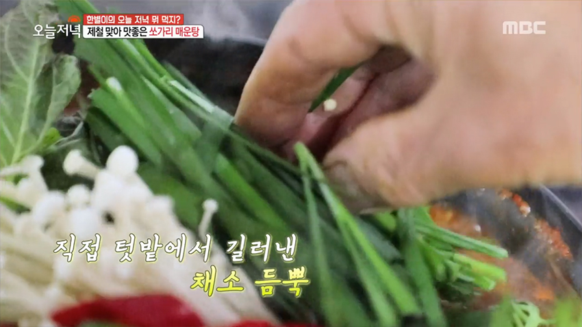 3. 준비한 장과 직접 텃밭에서 기른 채소 듬뿍 올려주면 자연산 쏘가리에 육즙이 어우러진 쏘가리 매운탕이 완성된다.