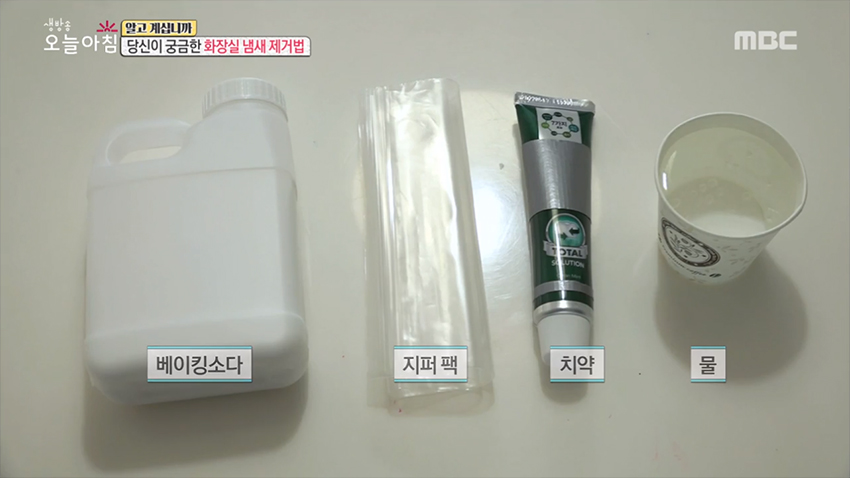 1. 베이킹소다와 지퍼 팩, 치약과 물을 준비한다.