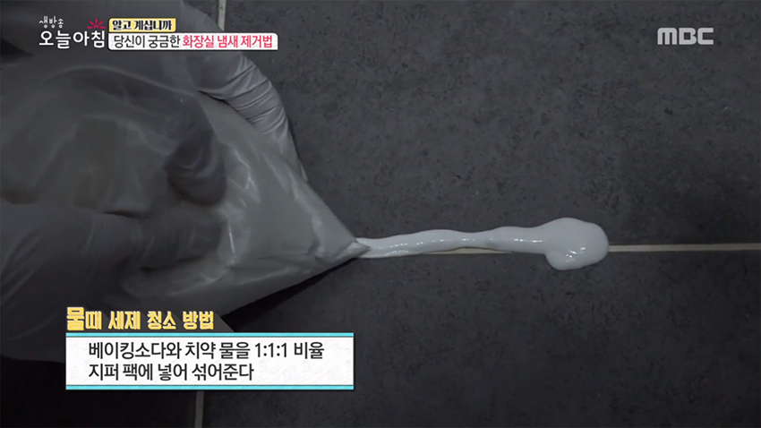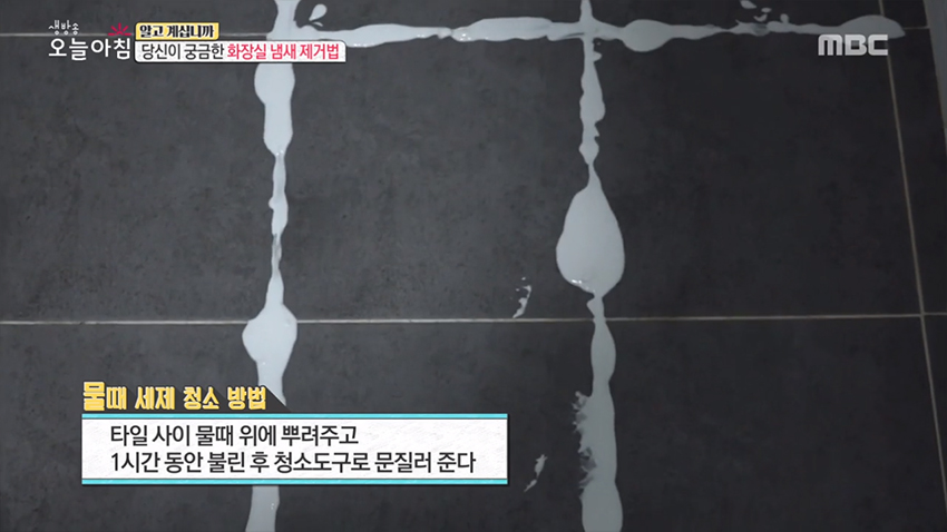 3. 타일 사이 물때 위에 뿌려주고 1시간 동안 불린 후 청소도구로 문질러 주면 효과적이다.