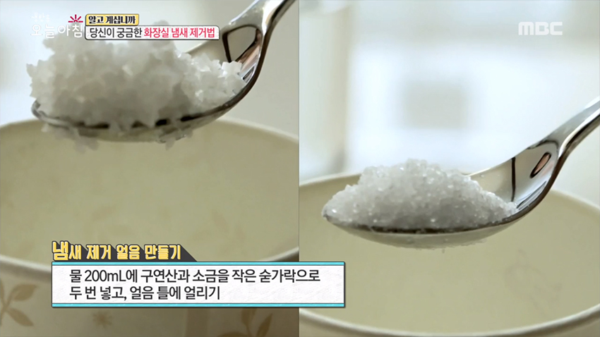 1. 물 200mL에 구연산과 소금을 작은 숟가락으로 두 번 넣고, 얼음 틀어 얼려 냄새 제거 얼음을 만든다.