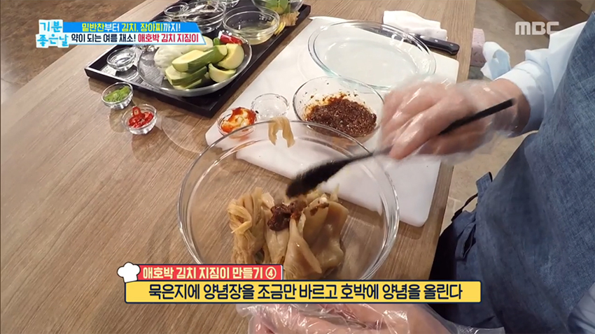 4. 묵은지에 양념장을 조금만 바르고 호박에 양념을 올린다.