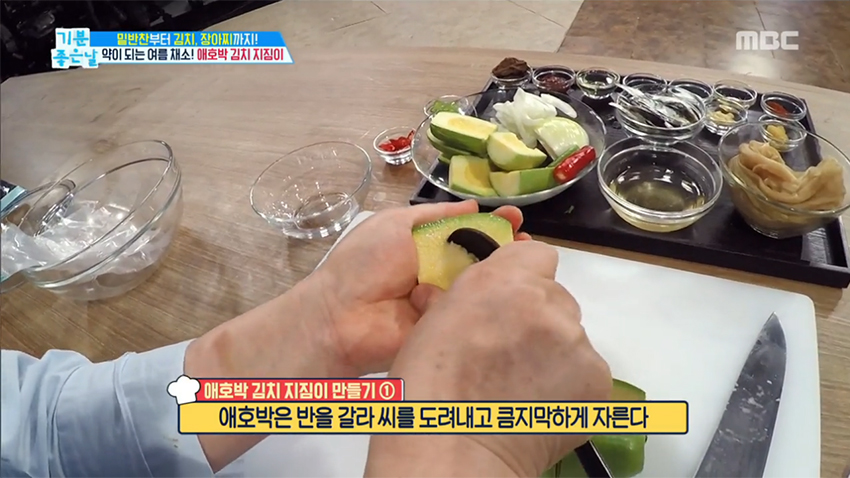 1. 애호박은 반을 갈라 씨를 도려내고 큼지막하게 자른다.