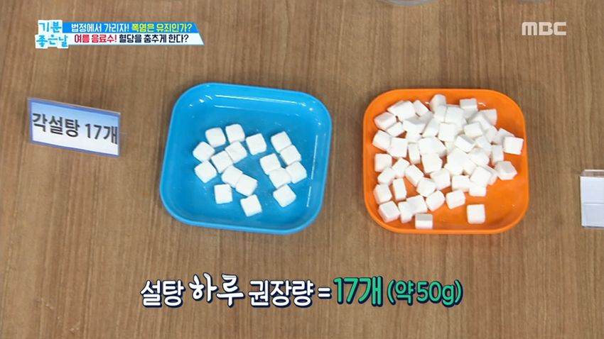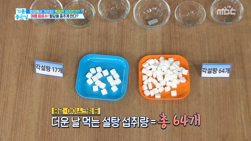 2. 설탕의 하루 권장 섭취량은 각설탕 17개(약 50g) 정도인데 음료와 아이스크림, 빙수 등을 섭취할 경우 총 64개의 각설탕의 양과 비슷한 양의 설탕을 섭취하게 된다.