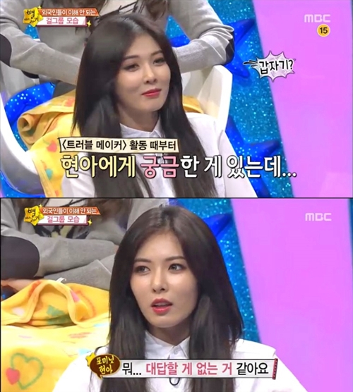1위는 '열애설에 대처하는 자세'가 차지했다. 외국인 별바라기 콩고 소년 라비는 "걸그룹도 똑같은 사람이고, 언제든 연애할 수 있는데 드러내놓고 연애를 못하는 모습이 외국인 팬으로 이해가 안 된다"고 말했다. 이어 라비는 포미닛 현아에게 "대체 트러블메이커로 함께 활동하는 장현승과는 무슨 관계냐"라고 거침없이 질문해 현아를 당황하게 만들었다.