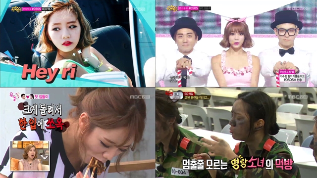 지난 주말, 안방극장을 뜨겁게 달군 새로운 먹방녀가 등장했다. <일밤-아빠 어디가>의 신흥 강자로 떠오른 막내콤비 정다윤-김민주를 제치고 걸그룹답지 않은 아낌 없는 먹방을 탄생시킨 걸스데이 혜리가 바로 그 주인공. '혜리 틴트', '혜리 피부' 등 여자 아이돌 필수 검색어를 모두 제치고 '혜리 먹방', '혜리 진짜 사나이', '혜리 짜장면'으로 도배된 현재 그녀의 연관검색어가 그 인기를 실감하게 한다. 무대에서의 깜찍하고 발랄한 모습과는 달리 짜장면을 다섯 젓가락 안에 먹고, 식판을 두 번 리필해먹는 과감함은 역설적으로 21살 풋풋한 그녀의 매력을 더욱 배가시키며 혜리를 <진짜 사나이-여군특집>의 최대 수혜자로 만들었다.