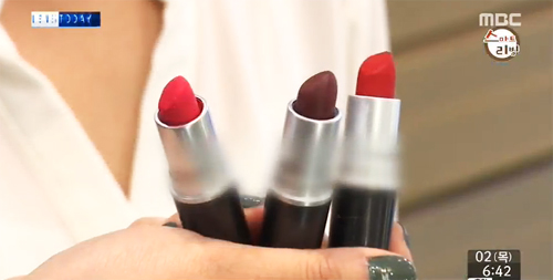 포인트는 입술인데 올가을에 주목받는 색은 와인 빛의 짙은 빨강색의 립스틱을 입술 라인을