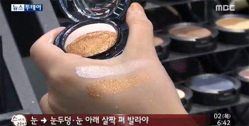 펄이 들어간 금색이나 보라, 분홍 계열을 골라 눈두덩과 눈 아래에 살짝 펴