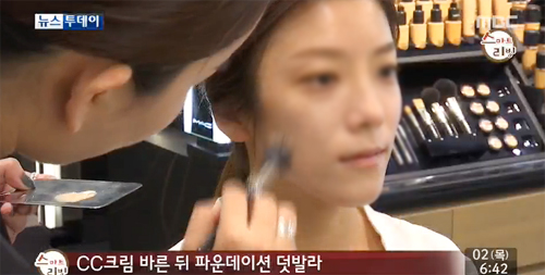 한국인의 피부는 대체로 노란 편인데 라벤더 색 계열의 CC 크림을 바른 뒤 파운데이션을