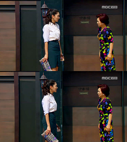 18일(목) 방송된 MBC 아침드라마 <모두 다 김치> 101회 선영(이보희 분)에게 아이와 남편이 있었다는 사실을 알게 된 현지(차현정 분)은 크게 놀라며 선영에게 재한(노주현 분)을 비난할 자격이 없다 소리친다. 이 장면에서 차현정은 어깨라인에 펀칭 포인트를 준 블라우스와 다크 그린 컬러의 H라인 스커트를 착용해 눈길을 끌었다. 여기에 차현정은 뱀피패턴과 컬러풀한 색감이 돋보이는 클러치를 매치해 시크하면서도 세련된 스타일을 완성했다.