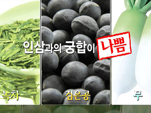 녹차, 검은콩, 무는 인삼과 함께 복용할 경우 인삼의 효과가 떨어지고, 열이 많은 소양인이나