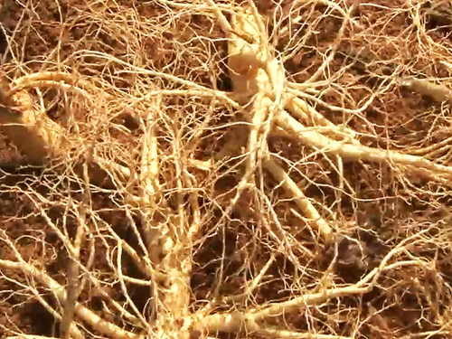 뇌두와 마르지 않고 잘 발단된 잔뿌리가 싱싱한 인삼이다.