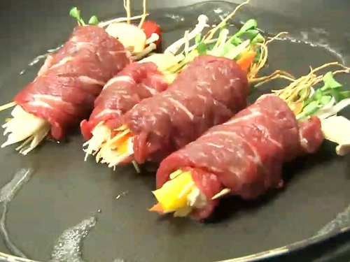 한 다음에 인삼과 채소를 고기 안에 말아 프라이팬에 살짝 익혀주면 완성된다.