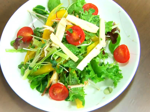 썬 다음에 삶은 닭 가슴살을 찢어 얹고 기호에 맞는 소스를 섞어주면 완성된다.