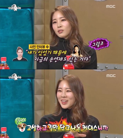 이에 MC 김구라는 "손연재 선수가 신수지를 롤모델로 했다"라면서 "힘들고 어렵게 리듬체조를 했는데 지금 손연재가 리듬체조의 과실을 독식하는 게 아쉽지 않냐"고 답하기 다소 까다로운 질문을 했다. 하지만 신수지는 "내가 있었기에 지금의 손연재도 있는 것"이라면서 "그건 어디 가지 않는 사실"이라고 당당하게 발언했다.