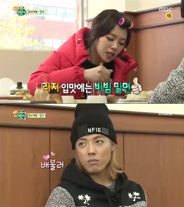 이날 강남-리지는 밀면을 주문하고, 리지는 밀면이 나오자 갑자기 헤어롤을 꺼내며 앞머리에 말고서 "밀면 먹을 땐 이렇게 쪼매놔야 한다"며 아이돌의 체면을 버린채 '폭풍 먹방'을 선사했다.
